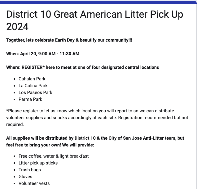 There's a form. There's a link in my blog You can come and join and hang out and we're doing area 10 is doing four different parks Come by pick up some trash meet your neighbors and have some breakfast. It's a great way to make our place a little bit better It's just parks, not the freeways. We can do what we can do, right?
